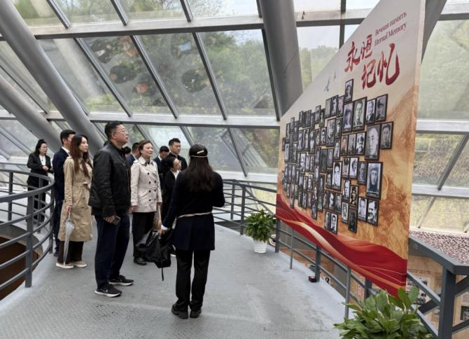 一行人在工作人员陪同下参观展厅,回顾中国空军与国际援华空军并肩抗敌的峥嵘岁月,随后在抗日航空烈士纪念碑前举行庄重凭吊仪式,全体人员肃立默哀、瞻仰纪念碑,缅怀英烈。