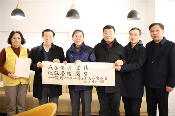 陈院士向南大和园社区赠送题字“感恩侨馨真情,砥砺奋进圆梦”和书籍《追求卓越 臻于至善——陈洪渊院士八秩华诞志庆集》;向“光荣在党50年”纪念章获得者,92岁老归侨陈汉民赠送题字“归侨楷模,青春不老”;向刘兴民赠送题字“勤奋耕耘倾真情,暖心聚力结硕果”。